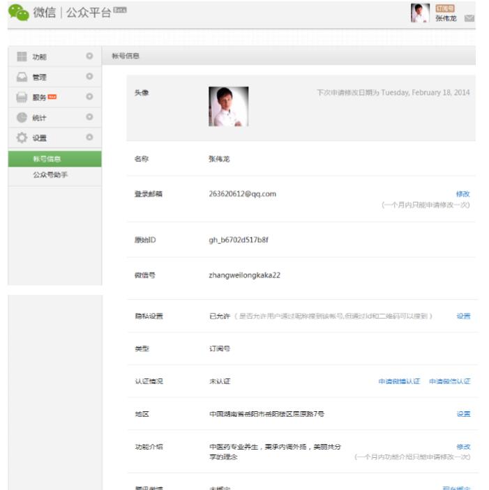 設(shè)置微信公眾平臺(tái)信息。 登陸后,左側(cè)共有五個(gè)選項(xiàng)分別為【功能】【管理】【服務(wù)】【統(tǒng)計(jì)】【設(shè)置】 點(diǎn)擊【設(shè)置】里的【賬號(hào)信息】:以下是需要更改的要點(diǎn)(見下圖)