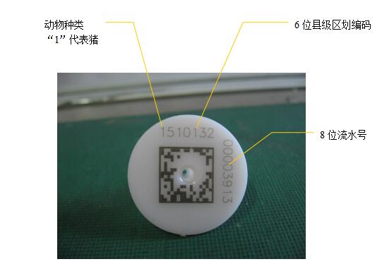 二維碼動(dòng)物標(biāo)識(shí)由二維碼和編碼兩個(gè)部分組成。二維碼采用加密技術(shù)的行業(yè)專(zhuān)用碼,具有防偽功能;編碼由動(dòng)物種類(lèi)+區(qū)劃編碼+標(biāo)識(shí)順序號(hào)組成。如下圖所示(以豬耳標(biāo)為例):